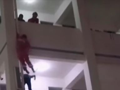 Video, 0 minutes 29 seconds Video 0:29 Firefighter kicks boy on ledge to safety 1 Nov 20191st November 2019